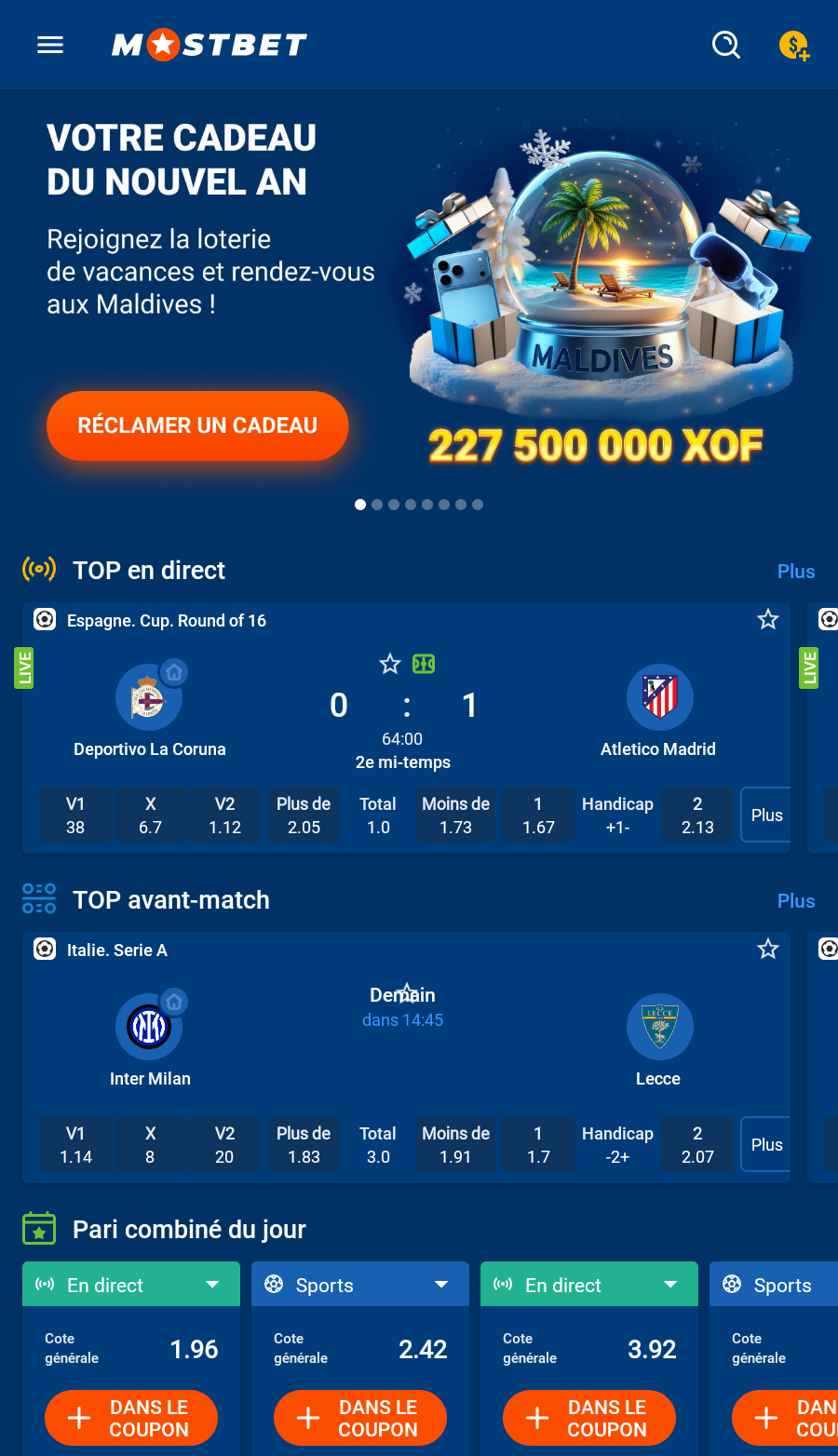 Pari combiné du jour - une sélection quotidienne des paris combinés les plus rentables. Si votre pari est gagnant, la cote sera augmentée davantage.