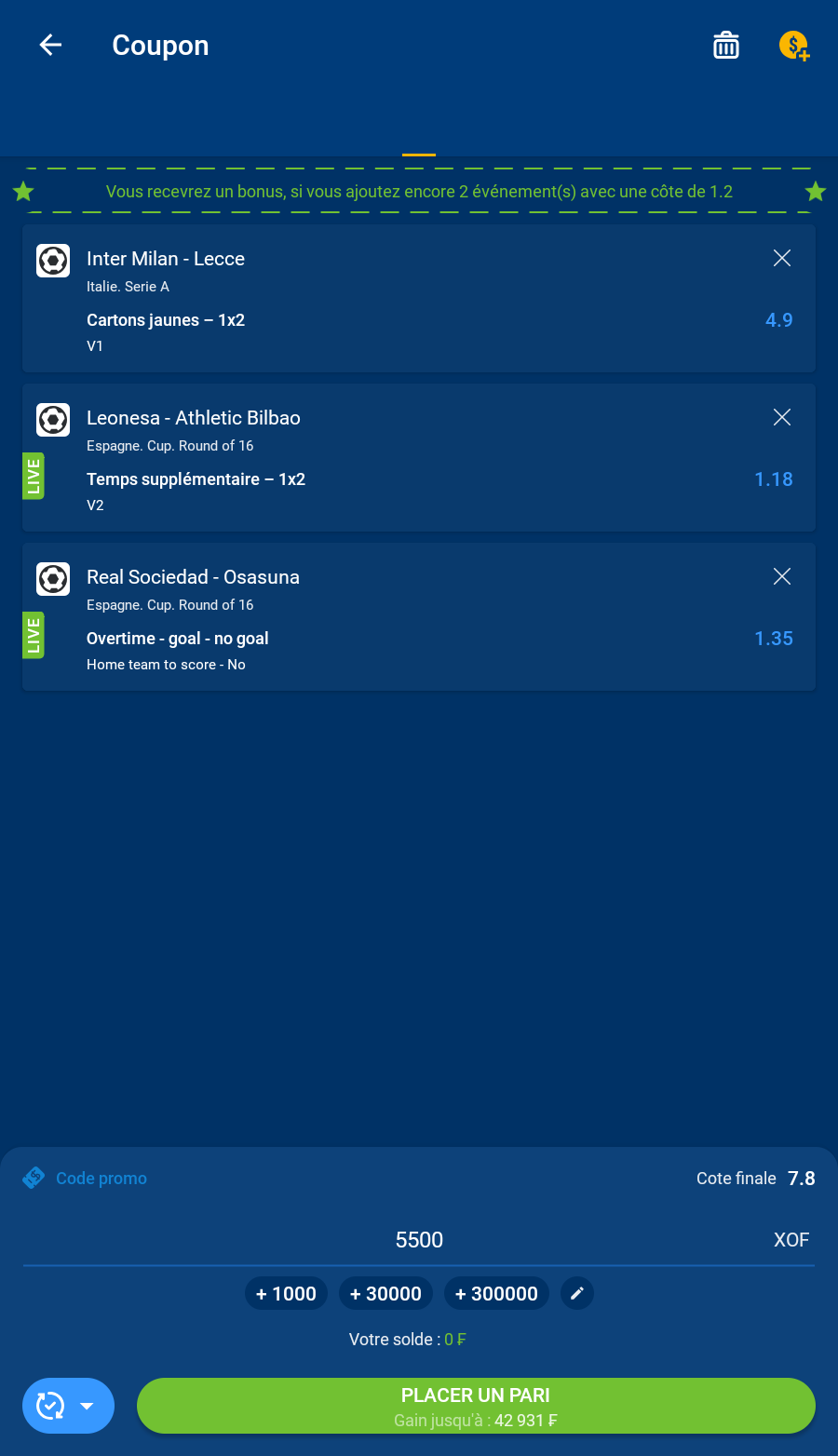 Pariez le bonus 5 fois sur des combinés de 3 événements minimum, avec une cote d'au moins 1,40, en 30 jours.