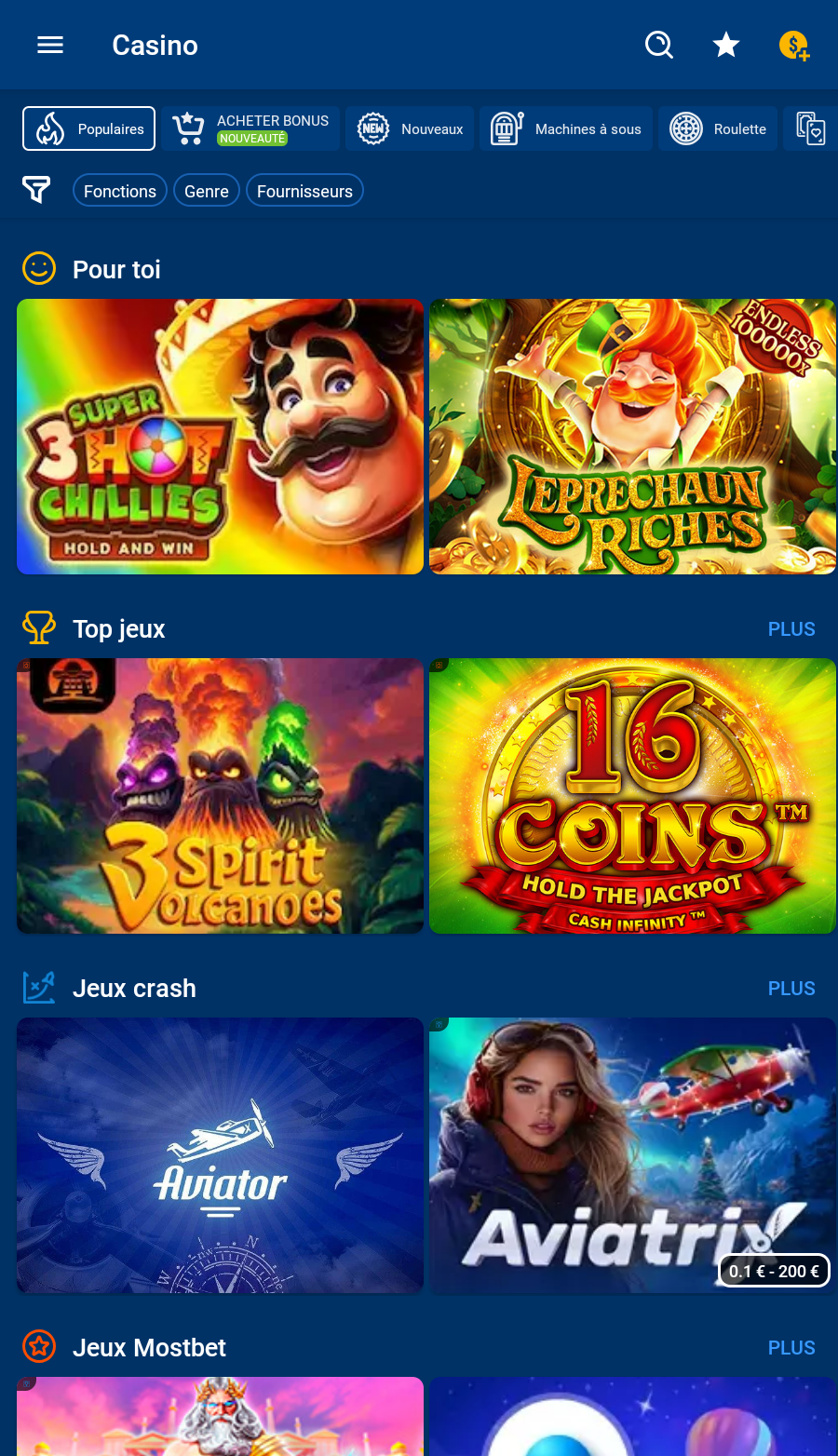 Crash games - section dédiée aux jeux de pari rapide de type “crash” ou autres jeux instantanés très populaires. Plus de 400 titres de crash games (par exemple : Aviator, Lucky Jet, JetX, Aviatrix, RocketX, etc.) où un multiplicateur augmente jusqu’à un crash. Mécanique provably fair pour la transparence et gains potentiels élevés.