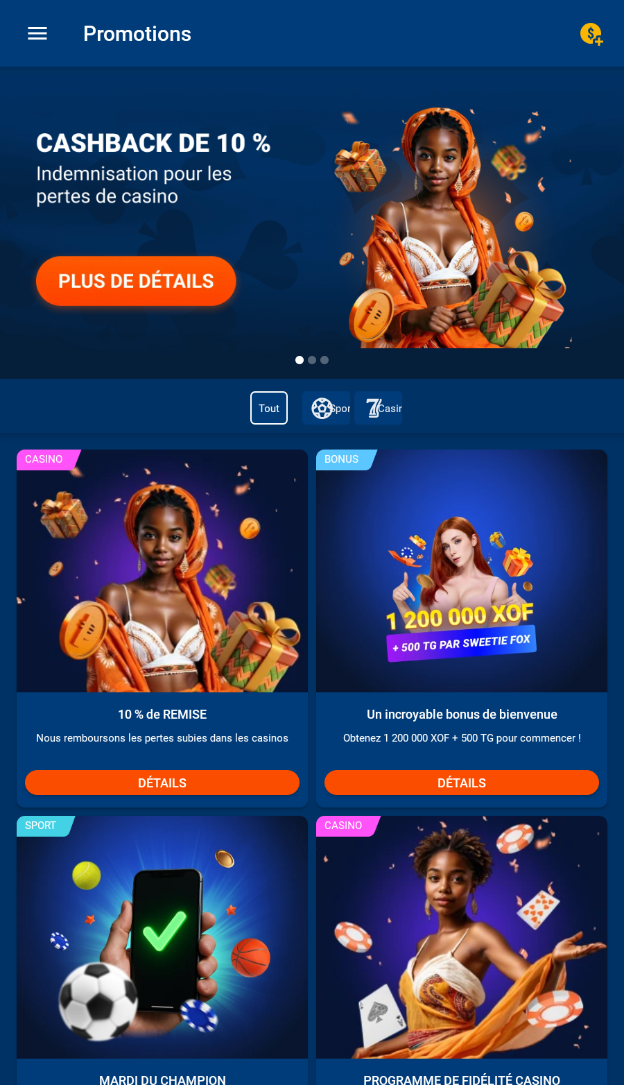 Bonus de 200% et 150 FS pour votre premier dépôt de 6 000+ XOF. Ou bonus de 200 % pour votre premier dépôt de 3 000+ XOF. Montant maximum du bonus : 300 000 XOF.